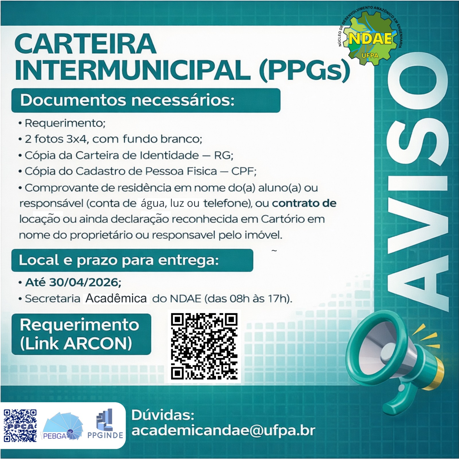 Os(as) discentes dos cursos de pós-graduação (PPCA, PEBGA e PPGINDE) devem entregar os documentos na Secretaria Acadêmica do NDAE.