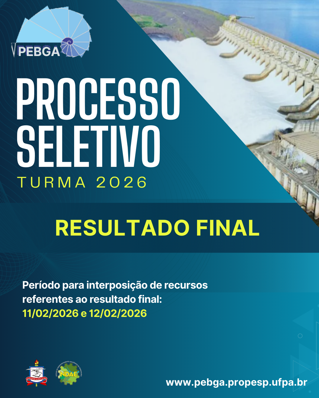 O Programa de Pós-graduação em Engenharia de Barragem e Gestão Ambiental – PEBGA, do Núcleo de Desenvolvimento Amazônico em Engenharia- NDAE, Universidade Federal do Pará – UFPA, no uso de suas atribuições legais, torna público o Resultado Final do Edital no 01/2025 – RETIFICADO – PEBGA/NDAE/UFPA que rege o processo seletivo para ingressantes na turma de 2026.