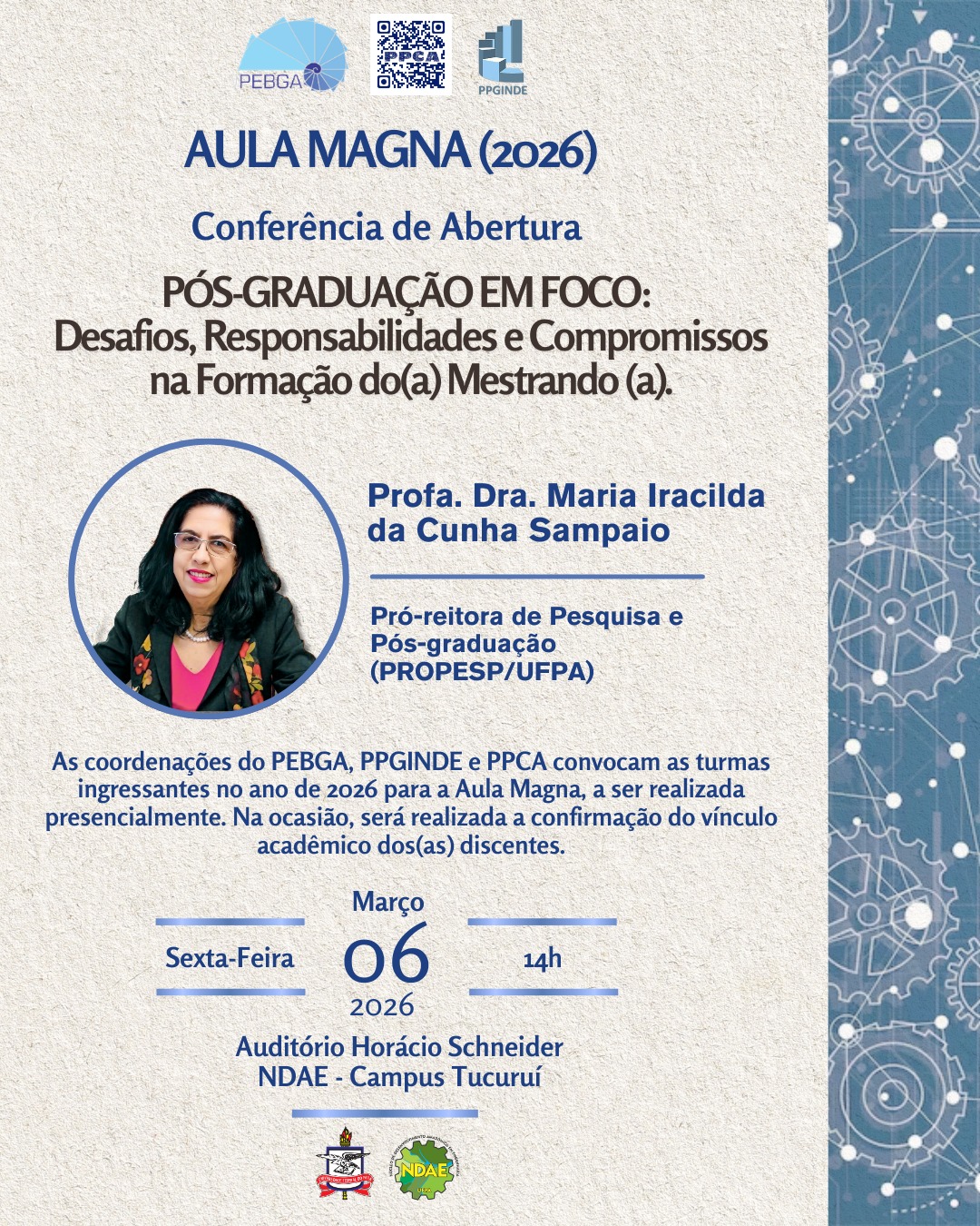 As coordenações do Programa de Pós-graduação em Engenharia de Barragem e Gestão Ambiental (PEBGA), do Programa de Pós-Graduação em Engenharia de Infraestrutura e Desenvolvimento Energético (PPGINDE) e do Programa de Pós-Graduação em Computação Aplicada (PPCA) realizarão, no dia 06 de março de 2026, às 14h, no Auditório Horácio Schneider (NDAE – Campus Tucuruí), a Aula Magna, presencial, destinada às turmas ingressantes de 2026.