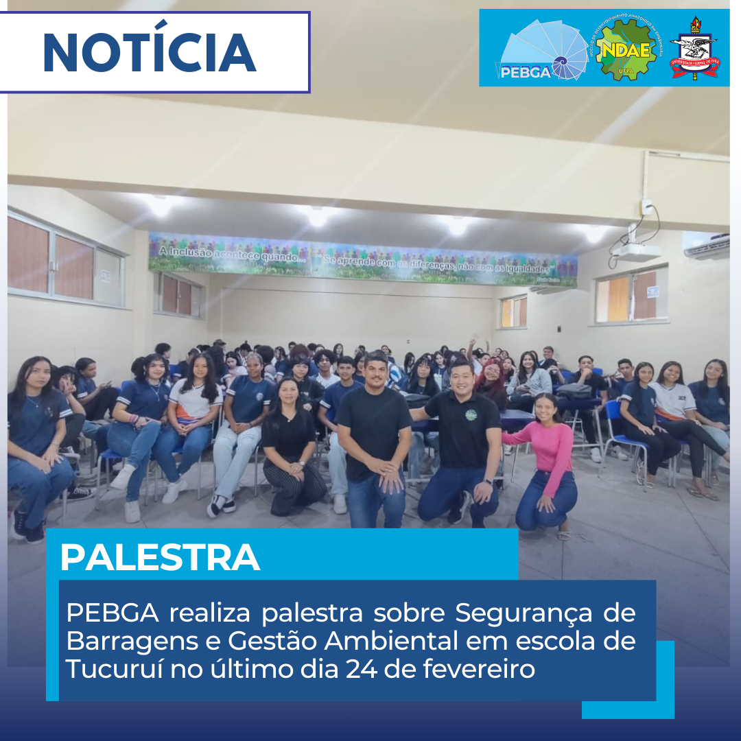 No dia 24 de fevereiro, o Programa de Pós-Graduação em Engenharia de Barragens e Gestão Ambiental (PEBGA/UFPA) realizou mais uma ação do projeto de extensão “Educação para a Segurança e Gestão Ambiental de Barragens”, levando conhecimento e conscientização a estudantes do ensino médio do município de Tucuruí-PA.